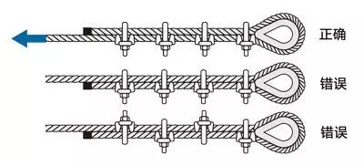 四、钢丝绳夹应把夹座扣在钢丝绳的工作段上,U型螺栓扣在钢丝绳的尾段上,不得在钢丝绳上交替布置,如下图所示: